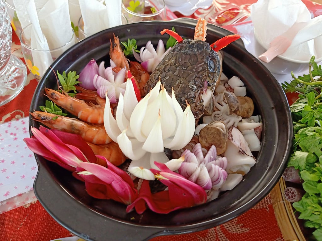 Món lẩu mắm vùng U Minh thì chắc chắn không thể thiếu những món ăn kèm như cá, tôm, mực và những loại rau rừng xanh tươi đặc trưng tại vùng rừng U Minh như đọt nhãn lồng, rau đắng, càng cua, bông súng, đọt choại,…
